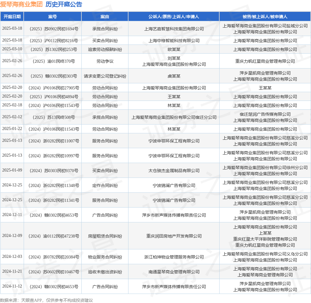 本站消息,根据天眼查APP显示,近日公布了一则上海爱琴海商业集团股份有限公司作为被告/被上诉人的开庭公告,详细内容如下: